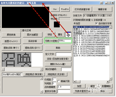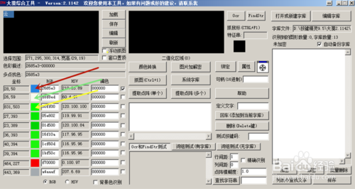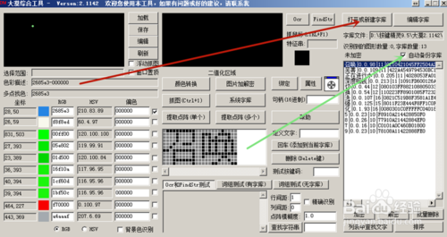 11、點(diǎn)中字體中顏色后,你想抓的字就顯示二值化區(qū),而且還有記錄字體的顏色值和坐標(biāo)!如圖