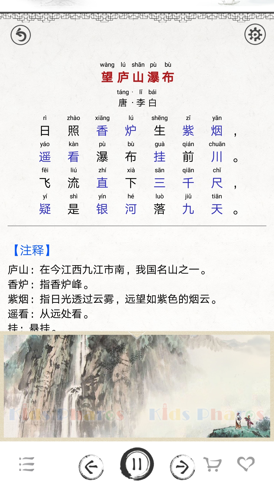 《中小學古詩詞大全》由專業(yè)的國學團隊制作。參照小學至初中的課本制作了418首古詩詞,每一首詩詞的內(nèi)容均配有“白云出岫”老師深情的朗誦、準確的拼音、全面的注釋、甜美的譯文、易懂的啟示、有趣的故事、水墨風插畫、還有實用/易用的學習功能。是學生學習古詩詞的得力助手!
