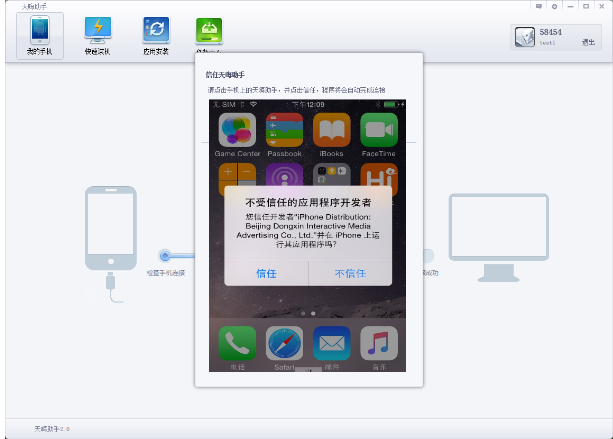 信任APP界面,點(diǎn)擊手機(jī)里的天嗨助手并打,此時(shí),PC端會(huì)自動(dòng)完成連接。(如長時(shí)間無響應(yīng),請重新接手機(jī))