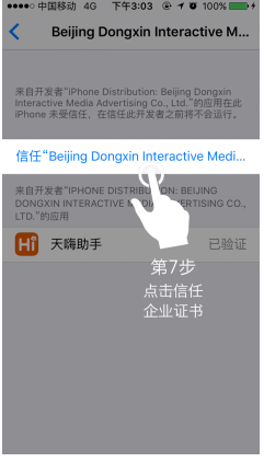 7.進(jìn)入企業(yè)證書后,點(diǎn)金藍(lán)色的【信任“Beijing Dongxin interactive Medi...”】