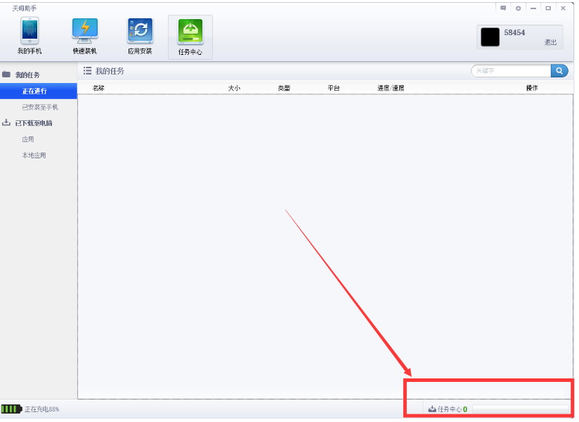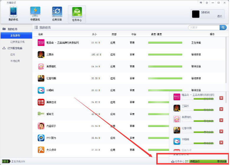 此時(shí)應(yīng)用會(huì)自動(dòng)安裝,圖中紅色方框中的任務(wù)數(shù)量會(huì)漸漸減少,說明應(yīng)用已經(jīng)傳輸?shù)搅耸謾C(jī)中,直到任務(wù)中心數(shù)字顯示為0的時(shí)候,說明所有應(yīng)用都已經(jīng)從電腦傳輸?shù)搅耸謾C(jī)中,如圖: