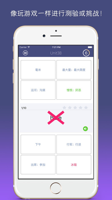 挑戰(zhàn)模式,只聽單詞發(fā)音,從8個選項中快速回答,非常刺激,讓你的心跳瞬間加速!