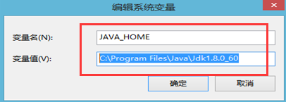 點(diǎn)擊新建,彈出窗口輸入:JAVA_HOME,值:輸入JDK安裝路徑【C:\Program Files\Java\Jdk1.8.0_60】,點(diǎn)擊確定