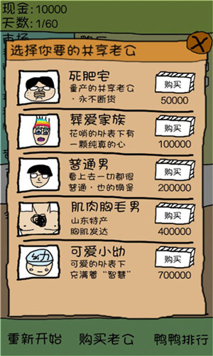 愛上我的鴨游戲是一款非常有趣的養(yǎng)成休閑小游戲,玩家在游戲中主要以賣鴨子為主,你可以賣鴨肉也可以整只出售,隨便你怎么賣,而且這里有好多種鴨鴨哦,每只都有自己的特色,當然有舍才有得啊,雖然看似很無聊很簡單,其實還是有一點策略性的,而且這里的鴨鴨都長的好魔性啊,畫風就不說了,反正也是作者隨手畫的,但可玩性還是比較高的。下面小編就簡單的介紹一下有關(guān)這款游戲的玩法。首先在游戲中最左上角顯示的是現(xiàn)金和天數(shù),玩家需要的限定的天數(shù)結(jié)束之前購買共享老公