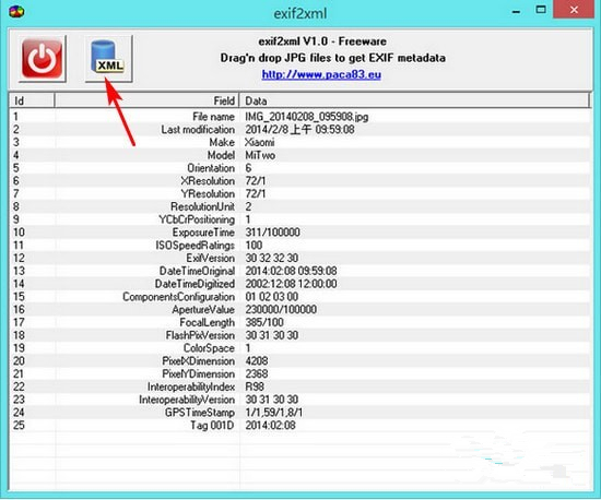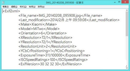 1.解壓縮所下載的檔案,執(zhí)行“exif2xml.exe”便可開(kāi)啟,無(wú)須安裝。開(kāi)啟后,將相片使用滑鼠拖拉到介面空白處,即可顯示該張相片的 EXIF 資訊,點(diǎn)擊上方有 XML的按鈕,便可轉(zhuǎn)出。2.轉(zhuǎn)出后,可使用記事本或 Excel 取得外部資料的方式來(lái)匯入開(kāi)啟。