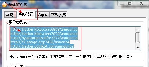 TIP?。喝绻阏也坏絋racker服務(wù)器可以填,很簡單,去下載一個種子,拖進(jìn)BitComet新建下載,如圖2,在高級設(shè)置中會有別人填好的服務(wù)器列表,復(fù)制后粘貼到你的新建種子即可。