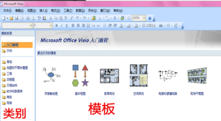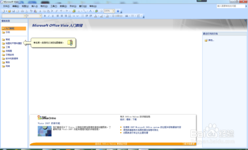 打開office visio2007界面:【菜單】【工具欄】【任務(wù)窗口】【繪圖區(qū)】