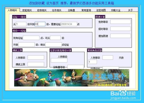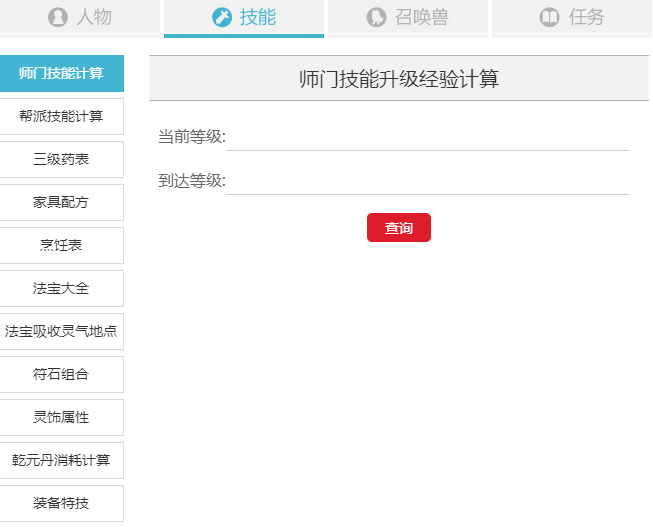 技能換算:師門技能計算、幫派技能計算、三級藥表、家具配方、烹飪表、法寶大全、法寶吸收靈氣地點、符石組合、靈飾屬性、乾元丹消耗計算、裝備特技