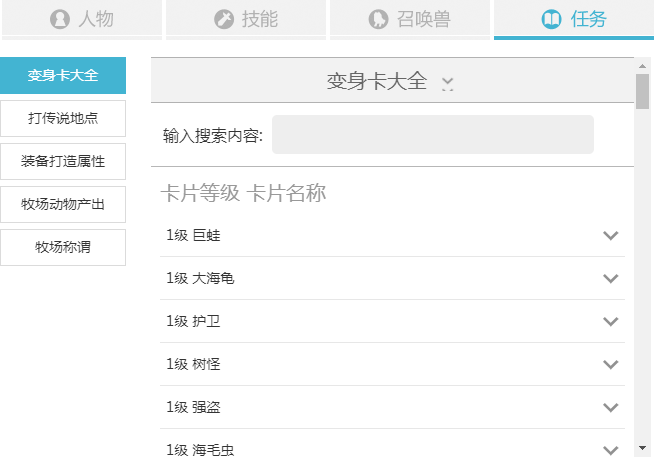 任務(wù)換算:變身卡大全、打傳說地點、裝備打造屬性、牧場動物產(chǎn)出、牧場稱謂