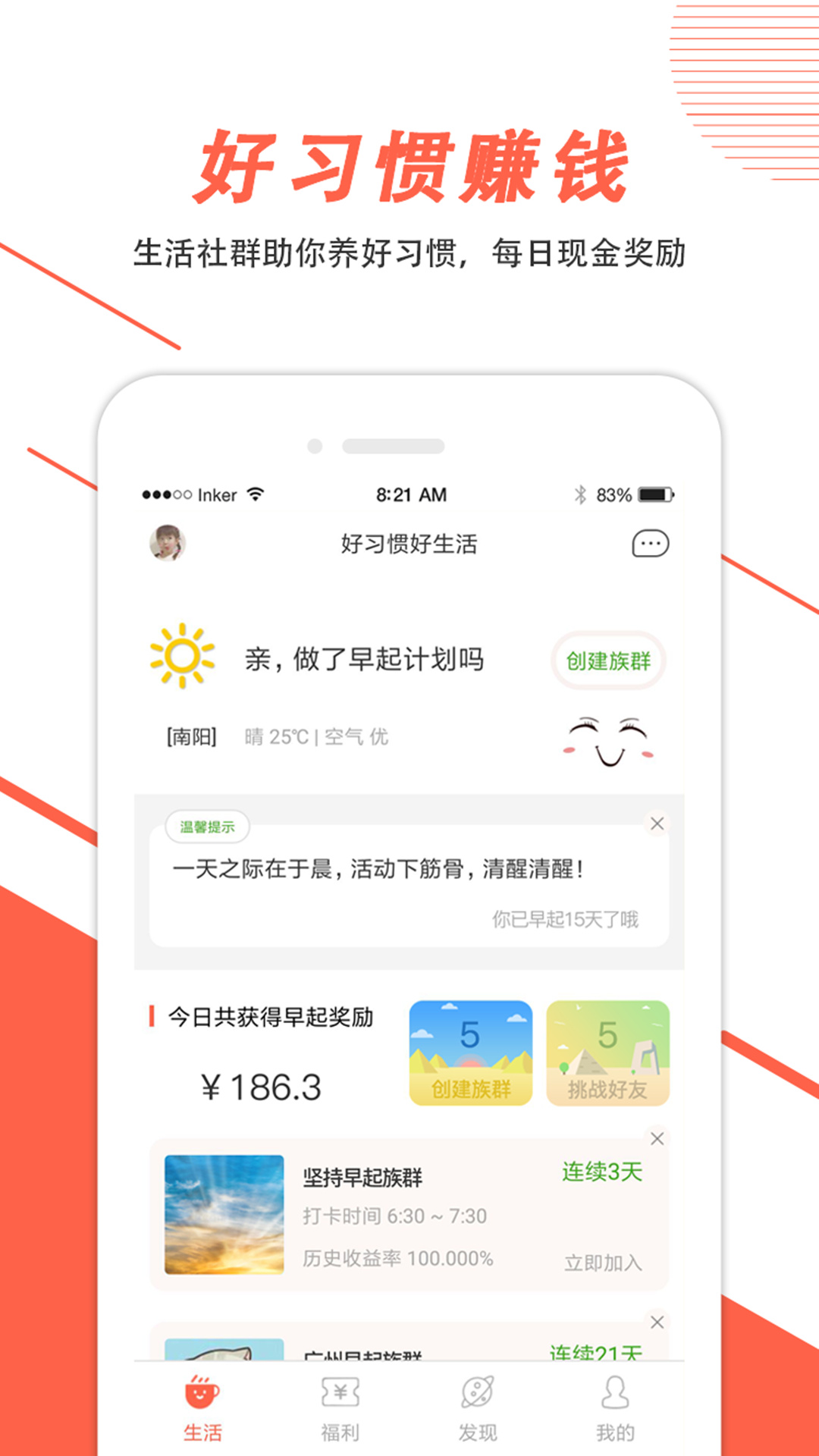 比如您想克服懶床、熬夜、久坐、吸煙、肥胖等各種不良習(xí)慣,來這里就對了,不僅能養(yǎng)成好習(xí)慣,還能幫你再賺一份,同時也能為您量身定制健康飲食運(yùn)動瘦身規(guī)劃建議。在大家不斷克服不良生活習(xí)慣保持健康的過程中,不知不覺就把錢給賺了!