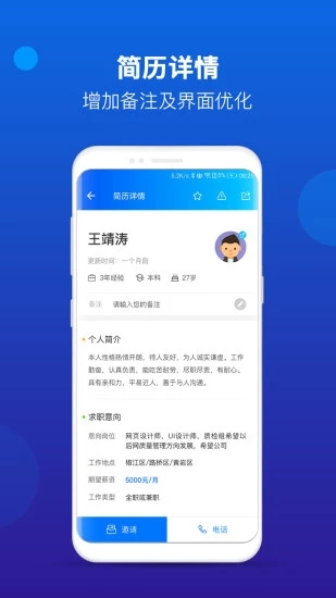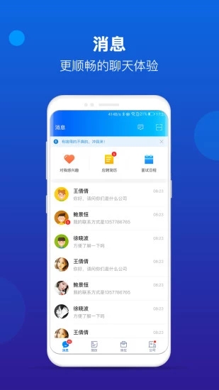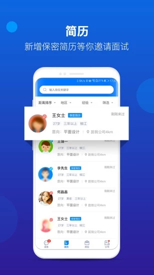 1、找附近人才:直觀的方式找到附近的人才,特別適合企業(yè)招聘行政或財(cái)務(wù)崗位的人才2、在線聊天:與求職者在線溝通,對(duì)求職者有個(gè)初步印象