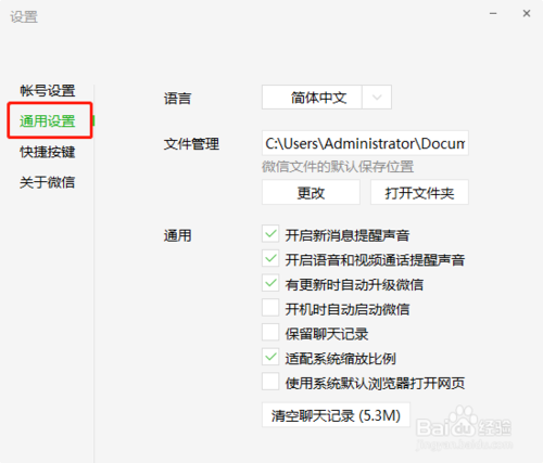 4、點擊左側(cè)通用設(shè)置,可以設(shè)置微信語言、文件存放位置、消息提示音等一些常用操作。