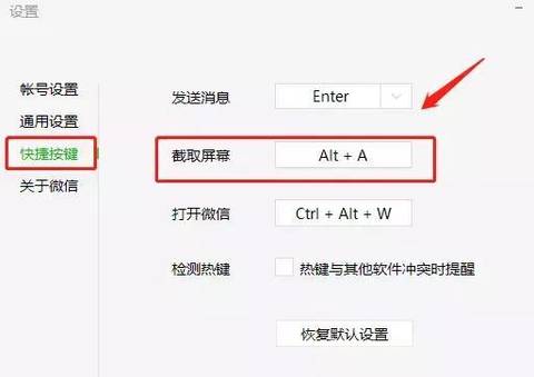 5、點擊左側(cè)快捷按鍵,可以設(shè)置發(fā)送消息、屏幕截取、打開微信的快捷鍵,并且可以恢復(fù)默認(rèn)設(shè)置。