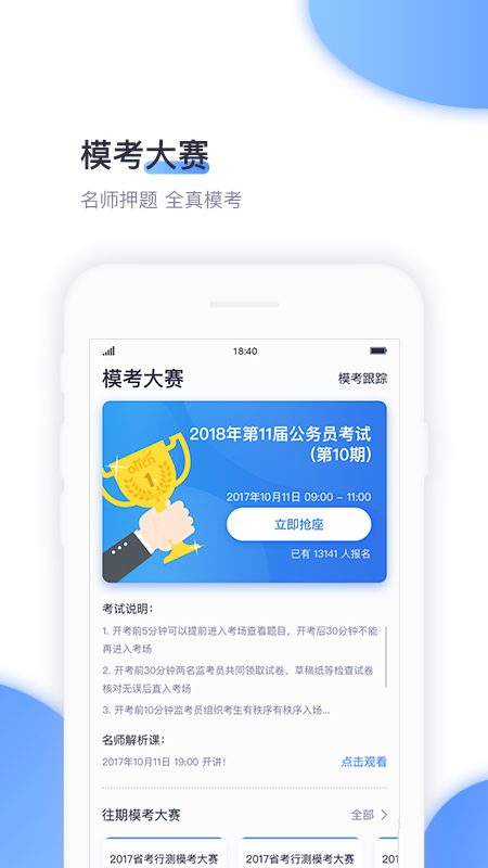 調(diào)整優(yōu)化了【模考大賽】的部分功能,推出全新的【國考報考答題挑戰(zhàn)】,帶你了解報考中一定要知道的常見問題,更有報考職位指導(dǎo)講座免費(fèi)聽!