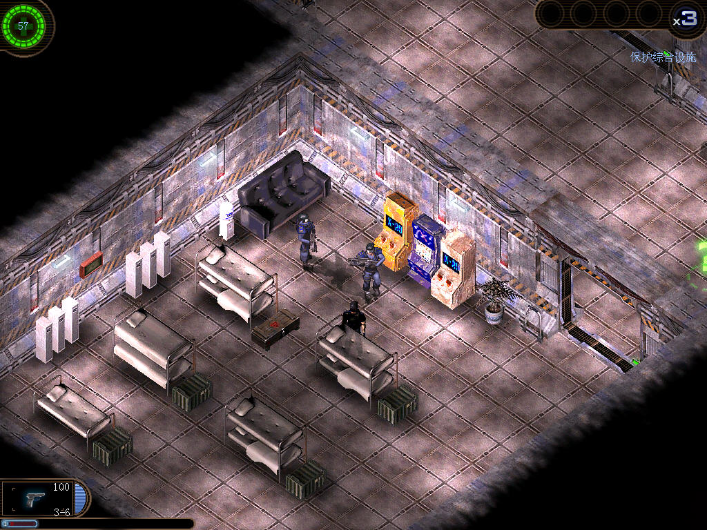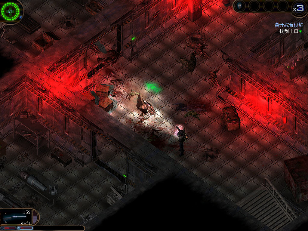 然后回到大廳,將金魚放到大廳中間的水洞里,然后你就能操縱金魚在下水道中去打開隔間的開關(guān)了。鼠標操縱方向,左右鍵是控制魚加速,但是加速后會有一小段的休息時間。注意在水中要小心刺球和那條大魚。隔間打開后消滅房間中的敵人(要先消滅掉中間生產(chǎn)異型的母巢)。坐電梯到上面的房間,消滅掉大異型。