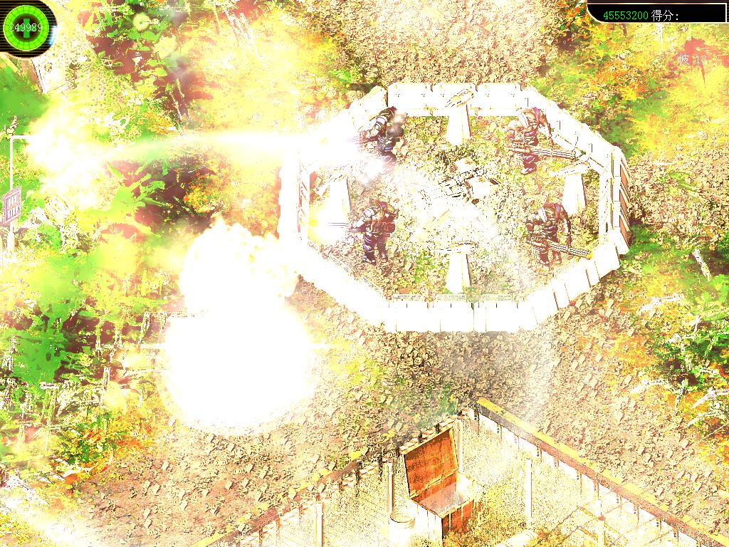 回頭再說Kurt,追逐SCHWANG來到了異型的母星。不要理會飛船,趕緊向身后的路逃走。來到一個大房間里,在高處有三個自動防衛(wèi)炮,下面還有不停出現(xiàn)的異型和機器人。消滅掉自動防衛(wèi)炮,站在低處的那個飛船噴氣口下的柵欄上,會發(fā)現(xiàn)右側(cè)高處的飛船噴氣口里的能源球激活了,打掉它。然后再打掉左邊的那個能源球。