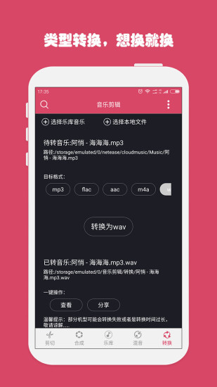 4、剪輯歌曲保存路徑:在剪輯或者合成完成后,歌曲會(huì)在對應(yīng)的列表中顯示,同時(shí)這些歌曲都會(huì)保存咋本地一個(gè)名為“音樂剪輯”的文件夾中,如果需要找到該歌曲,只需要打開文件管理器并找到“音樂剪輯”的文件夾