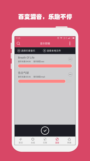 音樂剪輯是一款功能強(qiáng)大、操作簡單的音頻剪輯制作軟件,可以輕松的將手機(jī)中的MP3歌曲將自己想要的片段剪切出來,對于鈴聲制作、音頻合成都是不錯(cuò)的選擇。