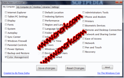 系統(tǒng)文件夾定制器(system folders customizer)是一個免費的實用小程序,適用于windows 7操作系統(tǒng)。你可以方便的把windows 7中一些常用功能添加到“計算機”、“控制面板”、庫或是桌面上,并能自動生成快捷方式圖標,用起來得心應(yīng)手,讓你的系統(tǒng)與眾不同。system folders customizer由名為paras sidhu的13歲少年開發(fā)。