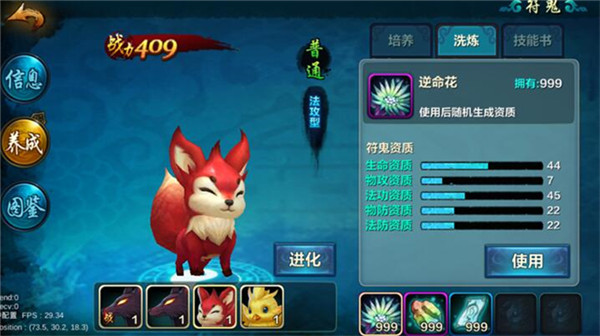 在獲得合適的符鬼后就要養(yǎng)成它們,要注意符鬼的等級只能通過妖獸丹進行升級(可從符鬼島獲得),如果對當前的符鬼不滿意可以用五色石、逆命花和還童符等來進行洗練,五色石可以隨機生成技能(也可打書,技能書從丁格奪寶的藏寶圖獲得),逆命花會隨機生成資質,而還童符則可以讓符鬼回到初始狀態(tài)。當符鬼等級到達35級之后,每過5級就會有一次進化機會,在完成突破之后即可進化為下一個階段,擁有全新的外貌與能力!