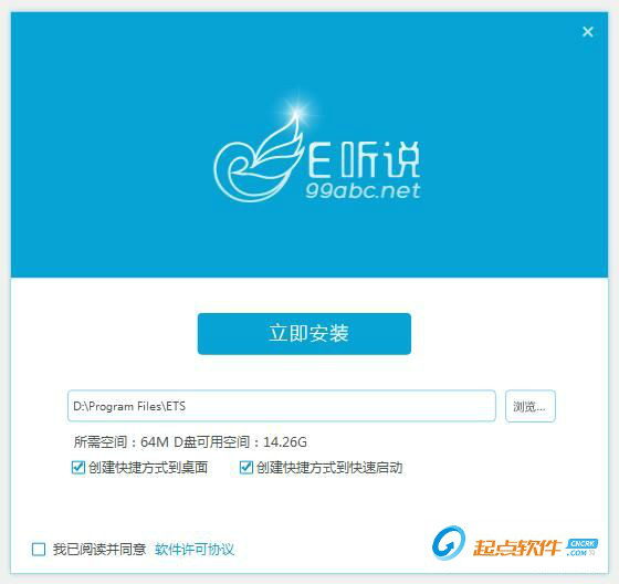 解壓在本站下載的e聽說安裝包,找到并雙擊“.exe”文件,進(jìn)入安裝向?qū)?br />安裝向?qū)J(rèn)為我們勾選了我已閱讀并同意軟件許可協(xié)議。點(diǎn)擊快速安裝就可以開始安裝軟件