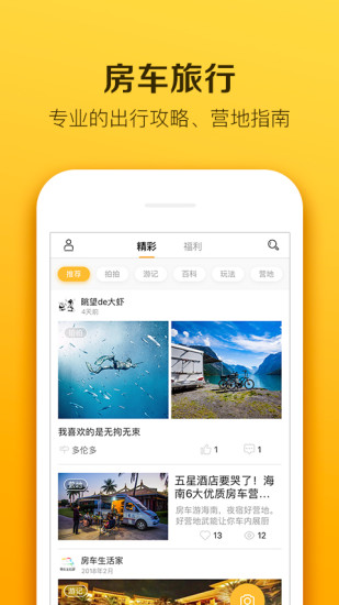 發(fā)布及瀏覽房車旅行內(nèi)容,可以與其他用戶間評論互動旅行達(dá)人游記分享,像老 司機(jī)般感受房車自駕旅行的樂趣