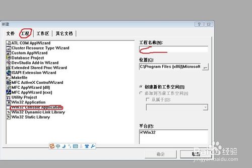 單擊“工程”,單擊“win32 Consle application",接著輸入工程名稱(自己起一個(gè)就可以了)。接著點(diǎn)擊”確定“。