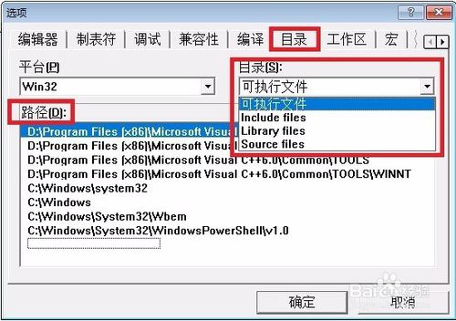 解決:打開(kāi)VC++6.0程序,依次點(diǎn)"工具(T)"—"選項(xiàng)(O)",彈出窗口在"目錄"選項(xiàng)卡里有四個(gè)選項(xiàng),分別為:可執(zhí)行文件(executatble files)、include files、library files、source files