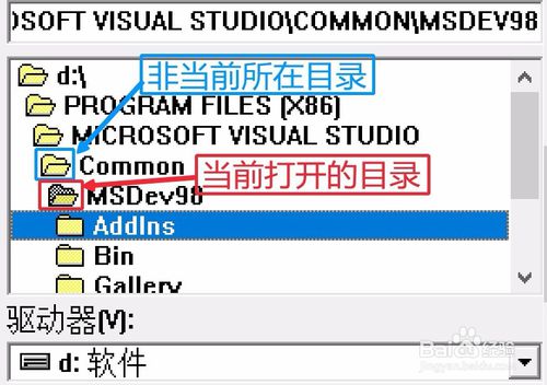 有些同學(xué)可能會(huì)找不到某文件夾,最簡(jiǎn)單的方法:如下圖直接雙擊VC6根目錄文件夾,重新定位目錄即可。