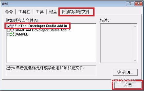 打開(kāi)VC6依次點(diǎn)"工具" - "定制" - "附加項(xiàng)和宏文件" - 勾選"FileTool Developer Studio Add-in" - "關(guān)閉"