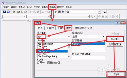 關(guān)閉并重新打開(kāi)VC++6.0程序,依次選擇“工具”-“定制”-“鍵盤(pán)”-類別選“文件”-命令“FileOpen”-當(dāng)前鍵“Ctrl+O”-點(diǎn)右側(cè)“移去”