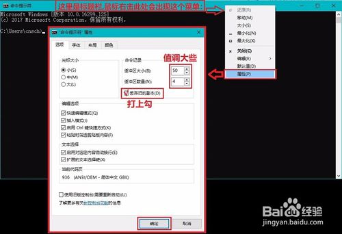 打開(kāi)“命令提示符(CMD)”- 右擊“標(biāo)題欄”-“屬性”-“命令記錄”欄;