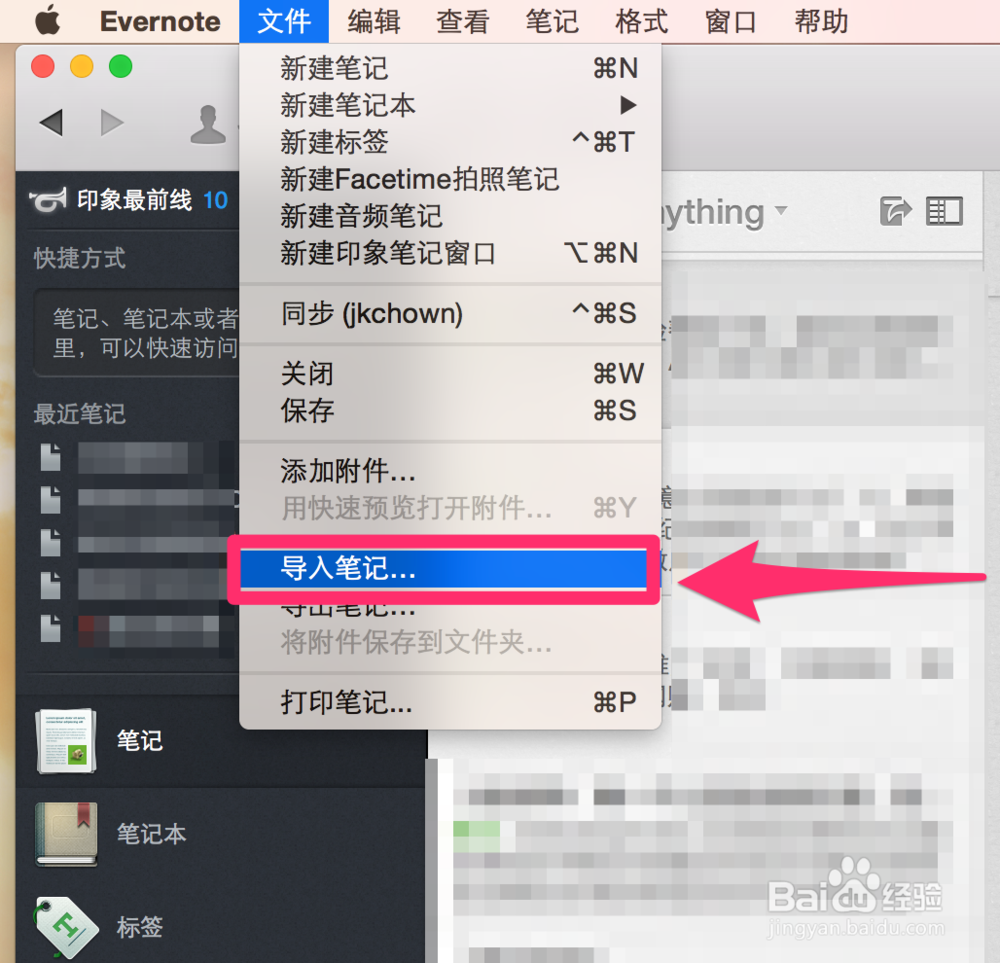 現(xiàn)在來進(jìn)行筆記導(dǎo)入的操作,依舊還是打開Evernote印象筆記頂部的文件選項(xiàng),然后從下來菜單中找到“導(dǎo)入筆記”這一欄并點(diǎn)擊進(jìn)入下一步。