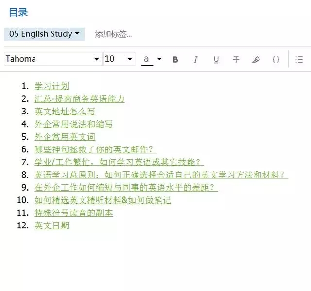 不過,擁有了很多跟同一個(gè)主題相關(guān)的筆記時(shí),你可能需要一個(gè)目錄,方便以后查看。比如,最近你在重點(diǎn)提高自己的英語能力,收藏了很多英語學(xué)習(xí)相關(guān)的信息,這時(shí)候就可以使用『筆記目錄』功能,一鍵創(chuàng)建目錄: