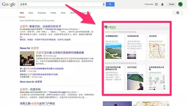 在使用Google或者百度搜索時(shí),你可以順便搜索印象筆記中的內(nèi)容,此功能是利用印象筆記·剪藏插件在關(guān)鍵詞搜索時(shí)自動(dòng)調(diào)取印象筆記帳戶中的內(nèi)容。