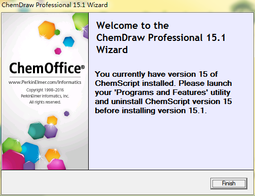 溫馨提示:如果用戶的電腦上安裝ChemDraw舊版本或者舊版本插件,會彈出以下提示框,請在安裝ChemDraw15.1 Pro前卸載舊版本及插件。