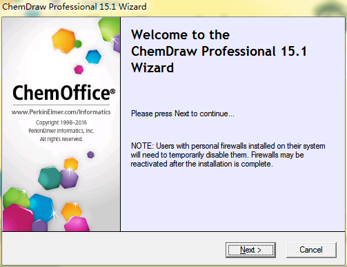 第四步:進入安裝ChemDraw的歡迎頁面,點擊Next,這里需要注意的是為了成功安裝ChemDraw15.1 Pro,程序會暫時禁用防火墻功能,安裝結(jié)束,防火墻會被重新激活。