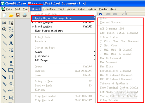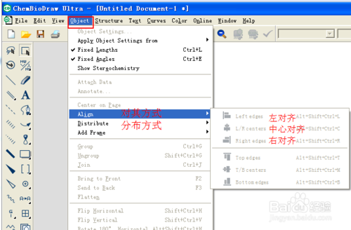5.為了使我們畫出的圖美觀,可以使用“Object”——“Align”,使化學式對齊。