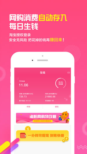消費(fèi)金額記錄自動存入淘粉網(wǎng)APP轉(zhuǎn)為虛擬存款, 可提現(xiàn)支付寶、微信。