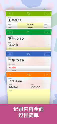 “寶寶生活記錄”的豐富功能均能方便快速地實現(xiàn)。根據(jù)移動設備的特點分別為iPhone和iPad優(yōu)化的界面和操作方式,讓您記錄、查看、編輯等操作能通過最簡單的步驟完成。
