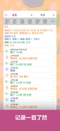 *哺乳喂食--可記錄母乳,母乳瓶喂,配方奶,輔食的記錄和統(tǒng)計,能自定義食物種類和數(shù)量;母乳可計時方式記錄;能設置鬧鐘提醒下次喂食時間。