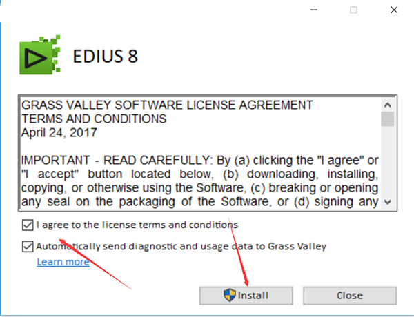 2.雙擊安裝EDIUS_8.53_2808_DL_Setup.exe,選擇接受協(xié)議,點(diǎn)install安裝