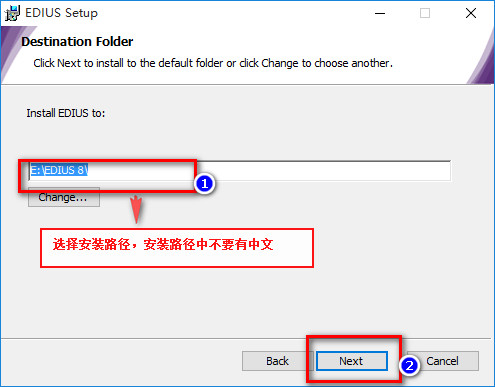 4.選擇安裝路徑。安裝路徑中不要帶有中文,例如小編安裝在E盤,安裝路徑為“E:\EDIUS 8\”.然后點(diǎn)擊“Next”繼續(xù)安裝。