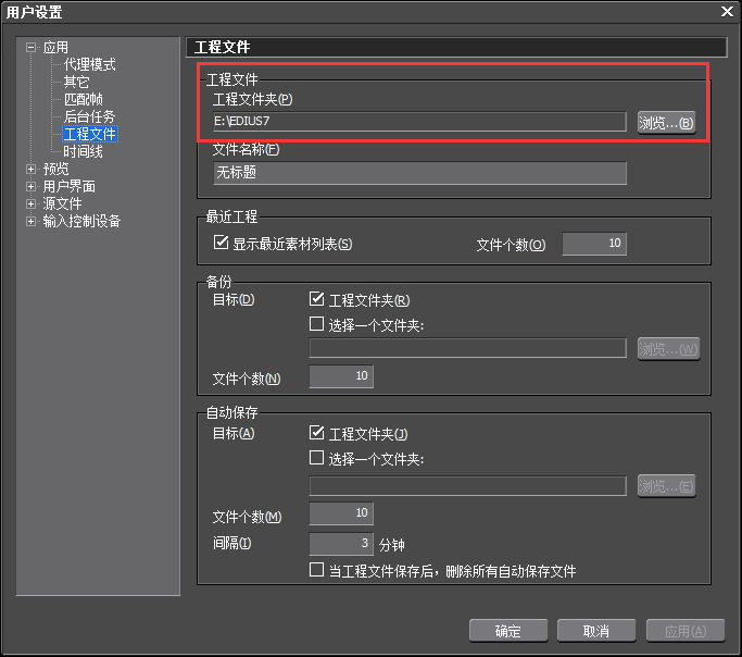 2、在彈出的“用戶設(shè)置”對(duì)話框中,選擇“應(yīng)用”選項(xiàng)中的“工程文件”子選項(xiàng),在對(duì)話框右側(cè),可以更改EDIUS工程文件的默認(rèn)文件夾位置。