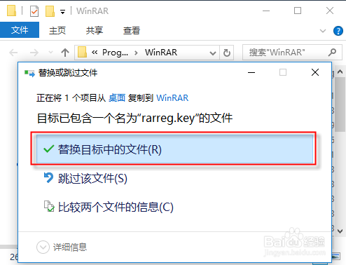 6、然后復制這個rarreg.key文件。選中這個文件,按ctrl+c復制,粘貼到WINRAR的安裝目錄下。粘貼按ctrl+v
