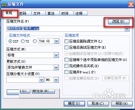 2、在壓縮文件對話框中點擊瀏覽按鈕,選擇壓縮后文件存放的位置