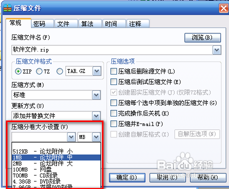 4、回到壓縮文件對話框的常規(guī)選項卡中,在壓縮分卷大小設置選項中選擇分卷壓縮文件的大?。ㄟ@里可根據(jù)壓縮文件的實際需求來選擇分卷文件的大?。?br />