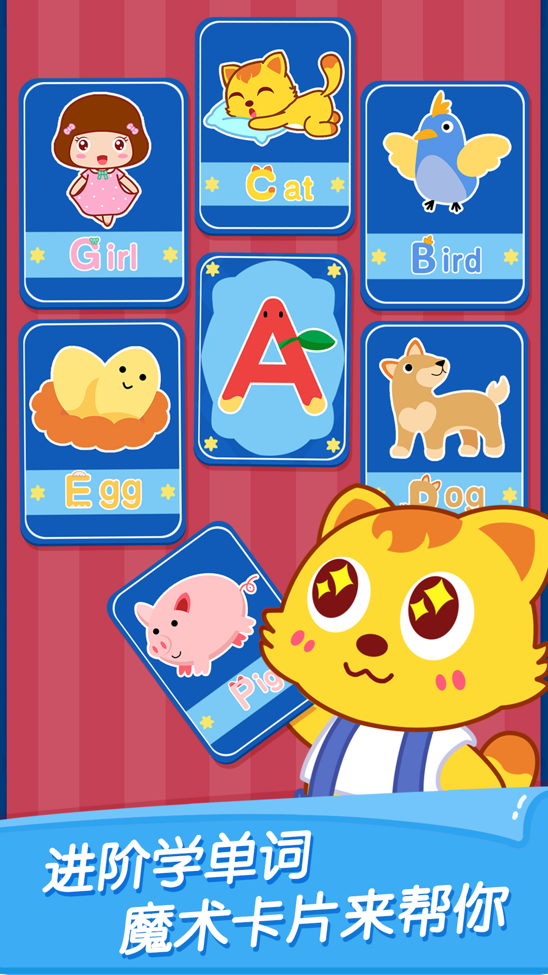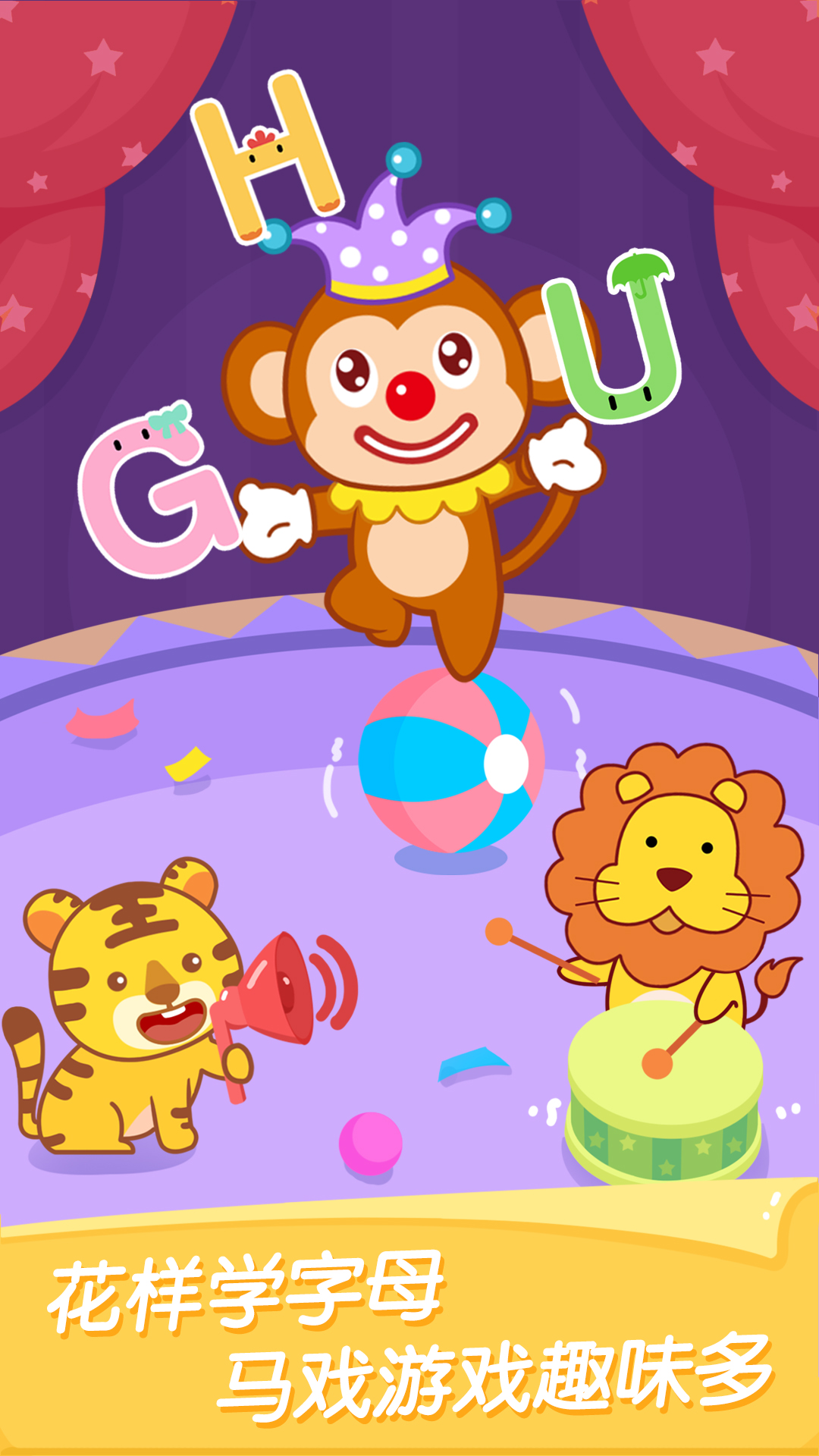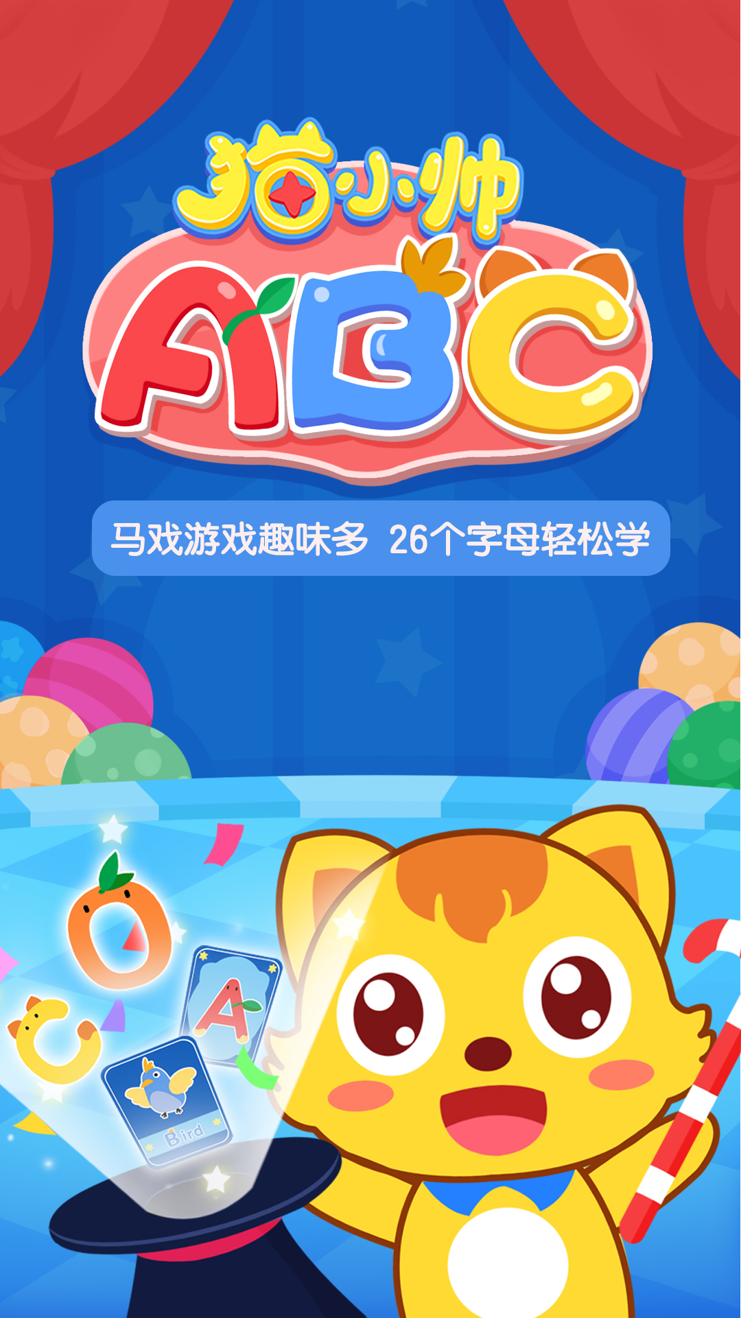 歡迎來(lái)到【貓小帥ABC】!這里有超Q萌字母+酷炫單詞卡,你將會(huì)在“認(rèn)、玩、練”3個(gè)學(xué)習(xí)關(guān)卡中,和字母?jìng)円黄饡惩嬗螛?lè)園、歷險(xiǎn)雜技團(tuán)、體驗(yàn)?zāi)g(shù)表演,循序漸進(jìn)掌握26個(gè)字母+基礎(chǔ)詞匯,快來(lái)一起high翻馬戲團(tuán)吧!