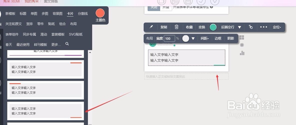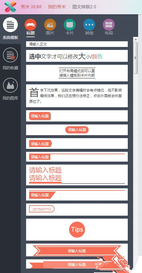 在秀米的編輯器中,有標題、圖片、卡片等等排版的模板,我們可以根據(jù)文章的內(nèi)容形式在選擇不同的模板類型