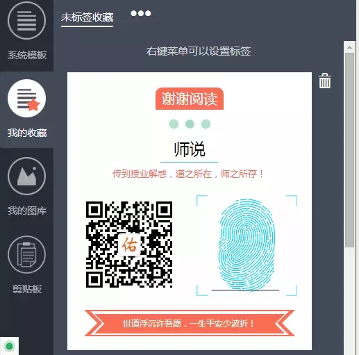 選中做好編輯的一個或多個模板,會出現(xiàn)模板的工具箱,尤其是選中多個模板的時候,工具箱只有三個工具:復(fù)制、刪除和收藏,選擇收藏,即可把選中的所有模板及其排版內(nèi)容原封不動地收藏到“我的收藏”文件夾里了。